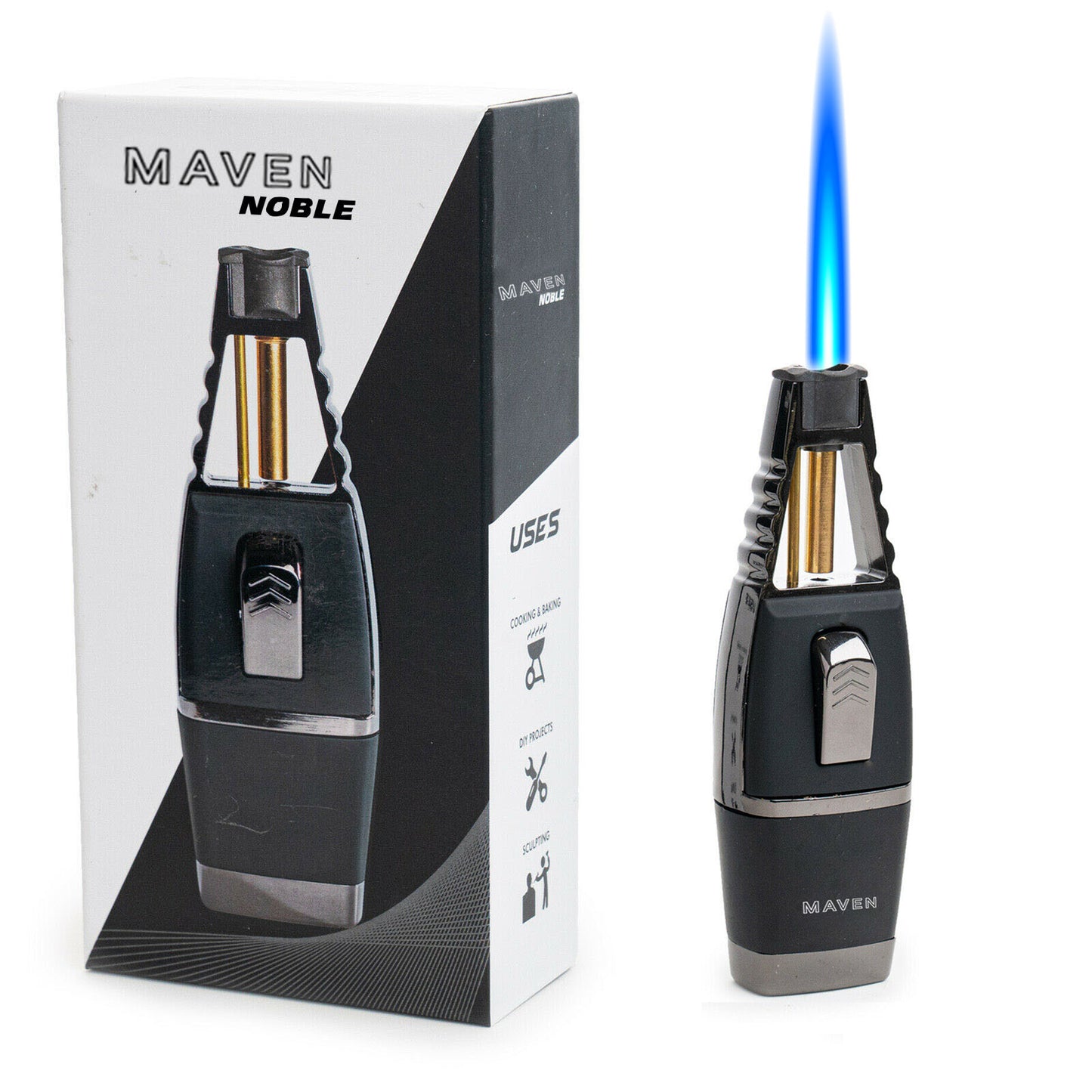 Get ready to light up your life with The Maven Noble Torch! With a single windproof jet flame and adjustable flame feature, this handheld torch is perfect for any situation. Refillable with butane and equipped with a safety lock and push button ignition, you'll always have a reliable and safe source of fire. Don't miss out on this must-have tool! Available in black or red!