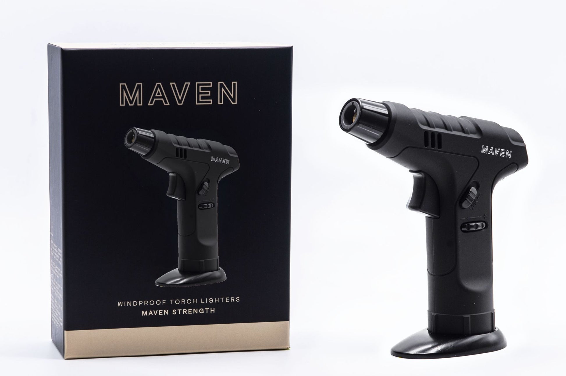 The Maven Strength Torch is a versatile hand and table torch with a single windproof jet flame. The adjustable flame and trigger pull ignition make it easy to use, while the refillable butane feature makes it a long-lasting tool. With a safety lock and ignition hold, this torch offers both convenience and safety. Light up with confidence and precision with The Maven Strength Torch! Available in black or blue!